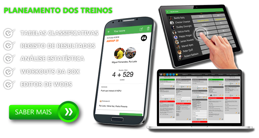 Crie o plano de aula/treino com exercícios e WODS pré-configurados. Associe movimentos e vídeos. Várias formas de registo de resultados (individual, pares, equipas, tempo, reps, rondas+reps, etc).